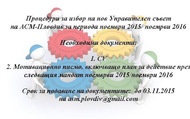 От днес 27.10.2015 до 03.11. 2015 вкл. може да изпращате Вашите кандидатури за член на Локалния управителен съвет към АСМ-Пловдив.