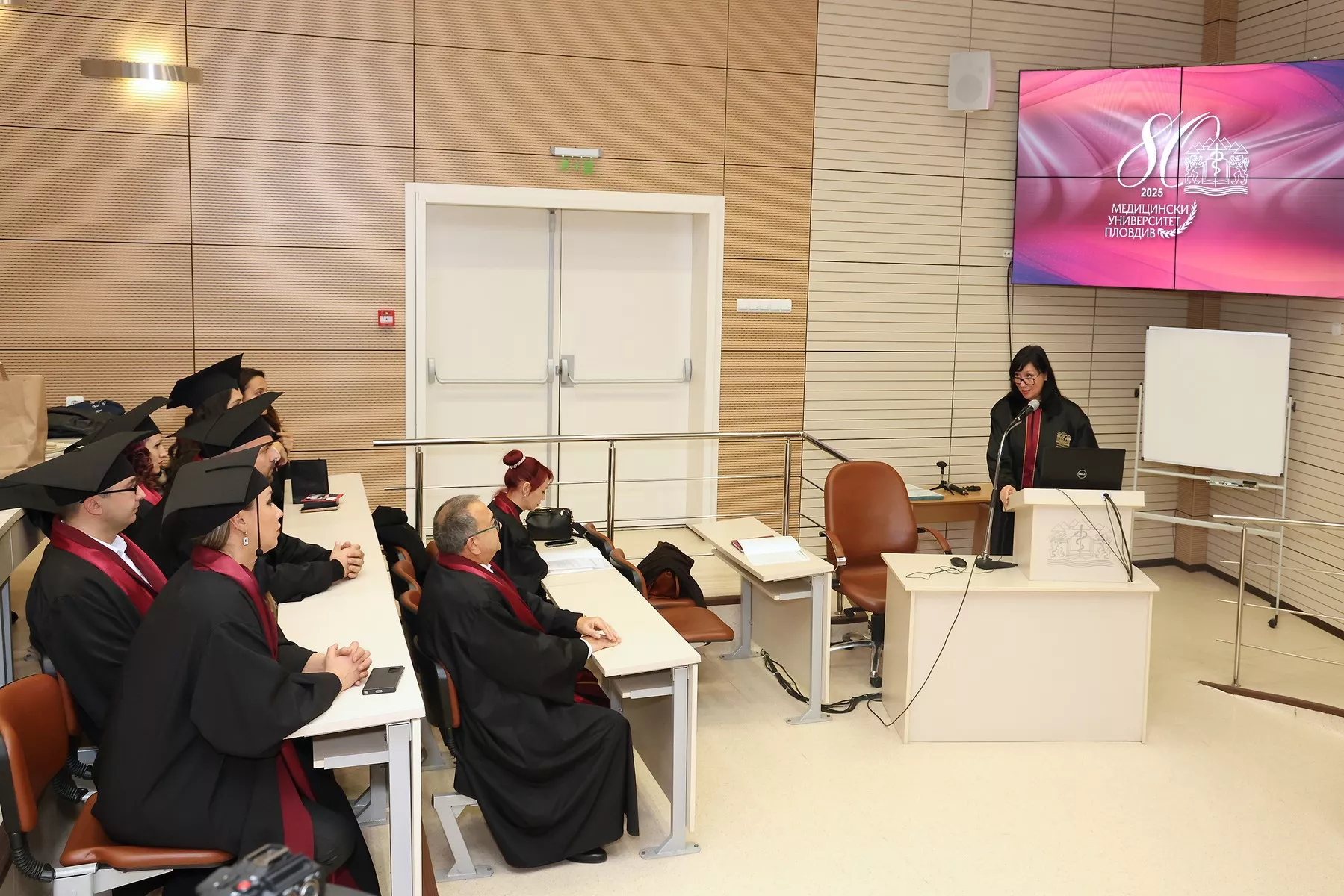 Приветствие от името на ректора проф. д-р Ангел Учиков поднесе зам.-ректорът по учебна дейност проф. д-р Веселина Горанова, която поздрави дипломантите с думите: „Избрахте труден, но достоен път. Път на безсънни нощи и тежки дежурства. Но именно това е истинската помощ – да бъдеш там, когато всяка секунда има значение. Не забравяйте, че зад всяка ситуация стои човек, който има нужда от подкрепа. В свят, в който дигиталните технологии се развиват със светкавична скорост, Вашата професия ще продължи да се отличава с едно непреходно качество – човечността. Тя изисква сила, дисциплина, смелост – качества, които вече сте доказали. Продължавайте да ги носите с достойнство, да се усъвършенствате и да се развивате, защото тази професия изисква постоянство и отдаденост“.