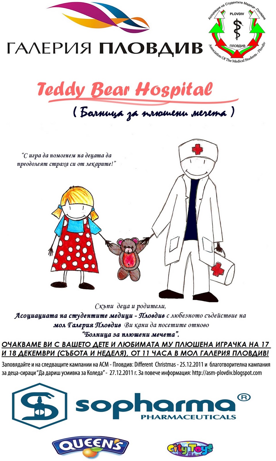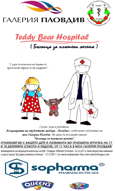 На 17 и 18 декември, /събота и неделя/, 11 ч., източен атриум ще се проведе Teddy Bear Hospital – международен проект, организиран ежегодно от студенти по медицина в различни страни. Проектът е насочен към деца на възраст 3 – 7 години. Идеята е под формата на игра да се преодолее страхът на малчуганите от „бялата манта”. За целта всяко дете донася своята любима плюшена играчка, която става „пациент”. Влизайки в ролята на родител, малчуганът споделя оплакванията на „детето си” и получава препоръки за здравето му от лекарите.